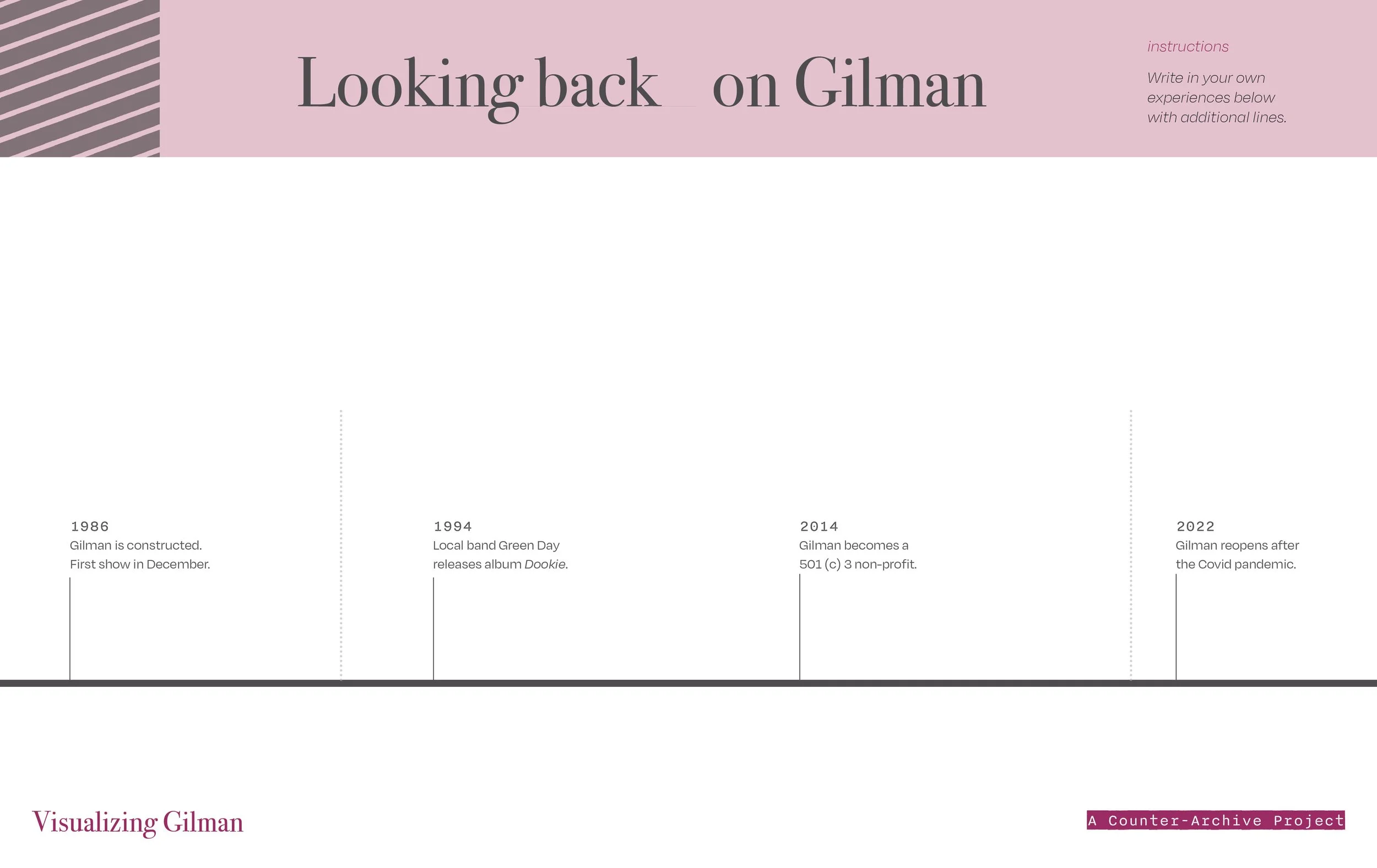 PROCESS: A cultural probe can be defined as a method of engaging subjects of study indirectly by supplying them a kit of questions and tasks designed to evoke intimate insights and diverse perspectives. As a series of tasks and questions, the cultural probe encourages critical written feedback. Through user-centered research, presentations to Gilman’s current board of directors, and two rounds of beta testing response acquired from the board members, I finalized the design and launched 60 handmade copies. As independent exercises, probes were deployed through targeted deliveries to key stakeholders no longer located in Northern California. Additional copies were available onsite at 924 Gilman. In this way, participants could make meaningful contributions without the presence of a researcher.